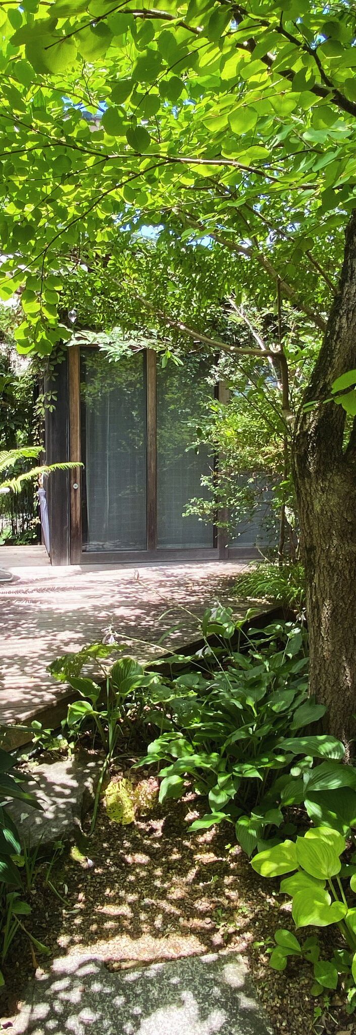 私は現在、夫と共に造園業で独立をし、庭のある一戸建てに住み、離れの小屋で仕事(主に図面を描いたりするオフィスワーク)をするというスタイルで暮らしていますが、大人になってから現在の住居に住むまで10年間以上マンション暮らしでした。京都市内でしたのですごく都会というわけではなく、近くに川や山も有り自然に飢えているなんて思ったこともありません。休みの日には山や海に遊びに行ったりもしましたし、便利な生活を満喫しておりました。しかし今、庭と家を持って15年、とても強く感じています。「庭の樹々に癒されている!」と。