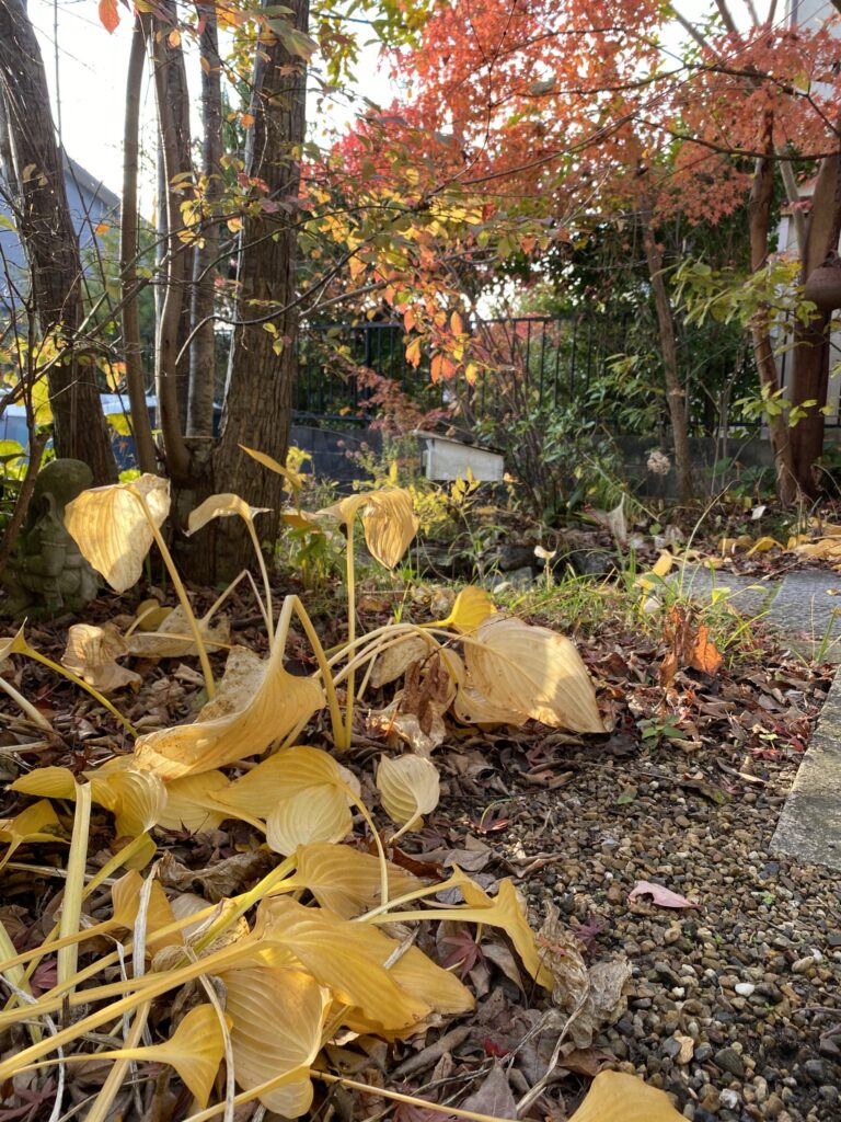 ▲ 落ち葉はそのままに。枯れもまた美しいギボウシは春にまた元気に芽吹く。