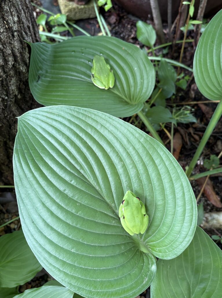 ▲ 夏になったら庭に現れるモリアオガエル。今年はつがい。