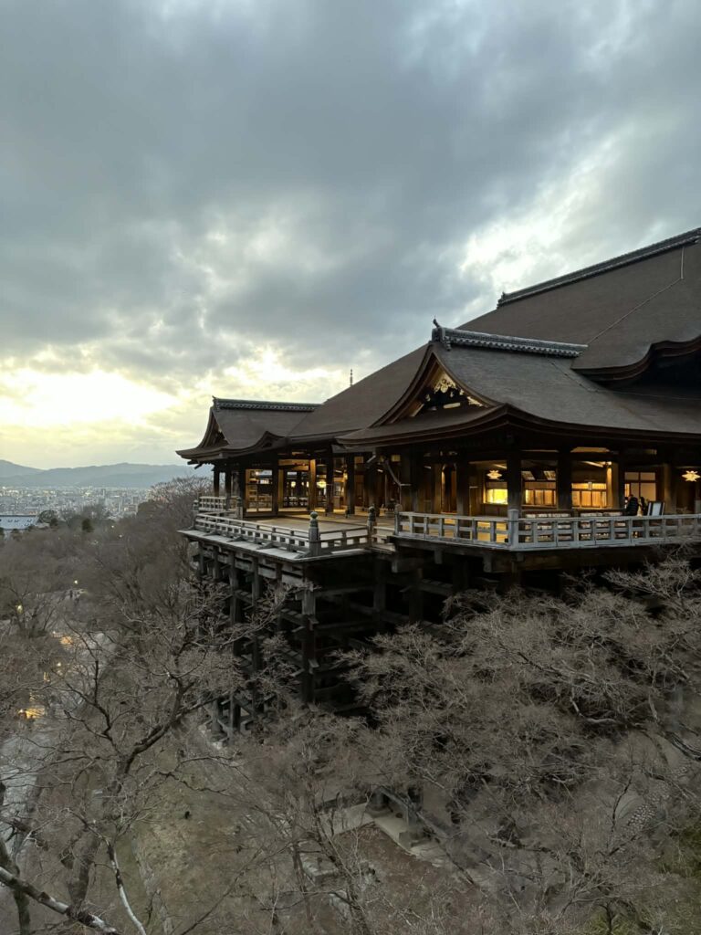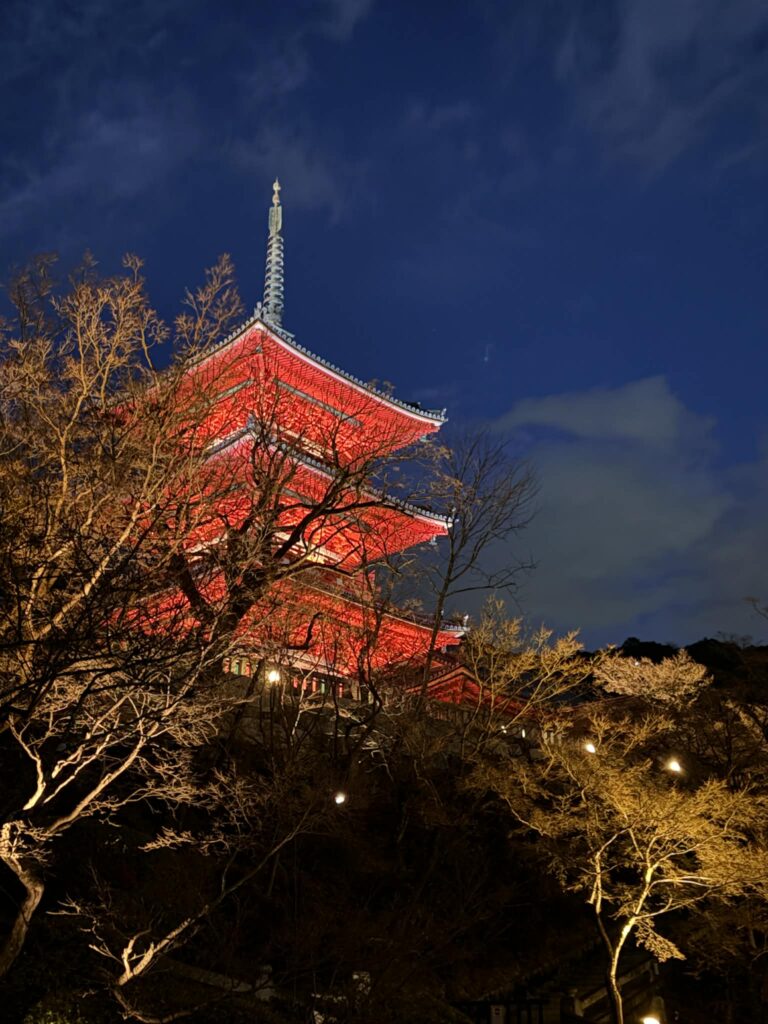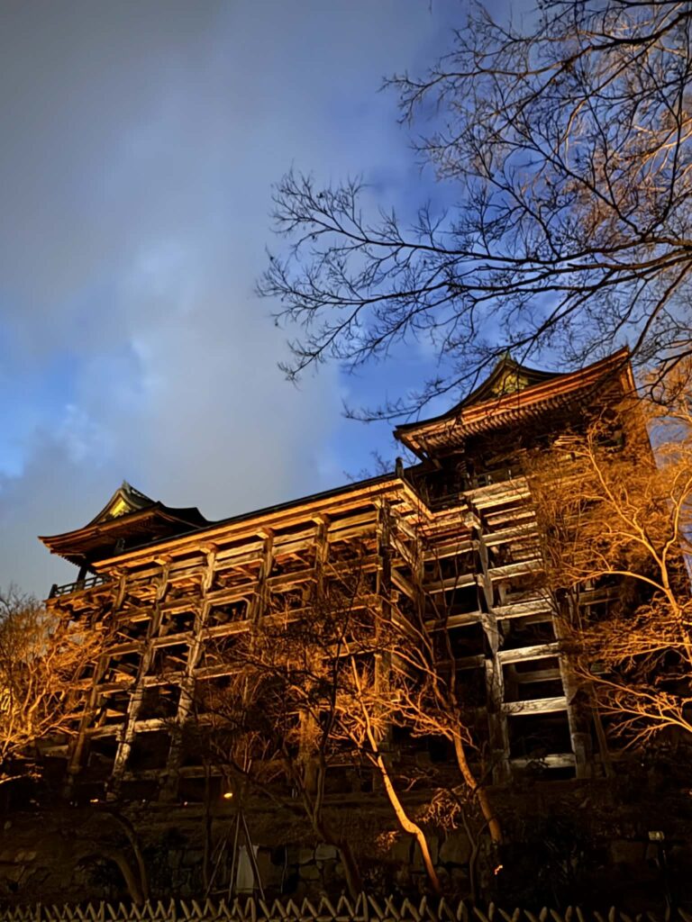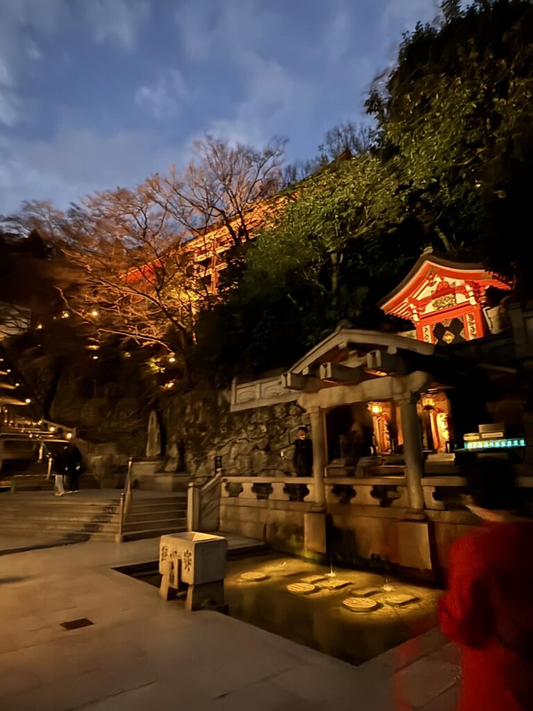 暗くなるにつれ、徐々にライトアップされ、懸造りの舞台が下からすごく綺麗に見えました。さっきまで大行列だった音羽の滝も、前を通るころには誰もいなかったので小学校の修学旅行ぶり?にお願いを。桜や紅葉シーズンは夜間拝観があるものの、人の多さがネックです。シーズンオフの閉門前が穴場でお勧めです。個人的には木が落葉している時期の方が、ライトアップされたときに建造物がよく見えて面白い。枝ぶりも楽しめます。